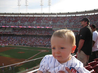 Ryne in the ballpark. He really did a great job. He turned into quite a flirt also, flirting and playing peek-a-boo with the girl behind us. Ryne even clapped at several times during the game, although some of those times were when Reds fans where cheering/clapping. But hey, he's only 1-year old...clapping for any baseball is fine by me!